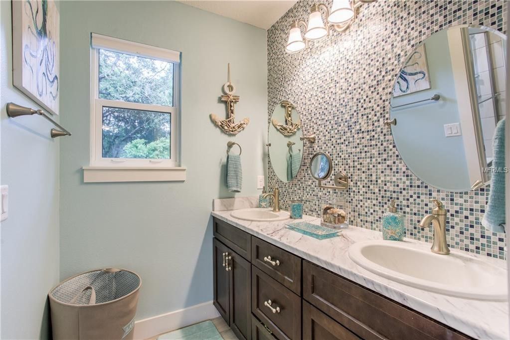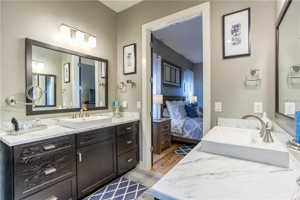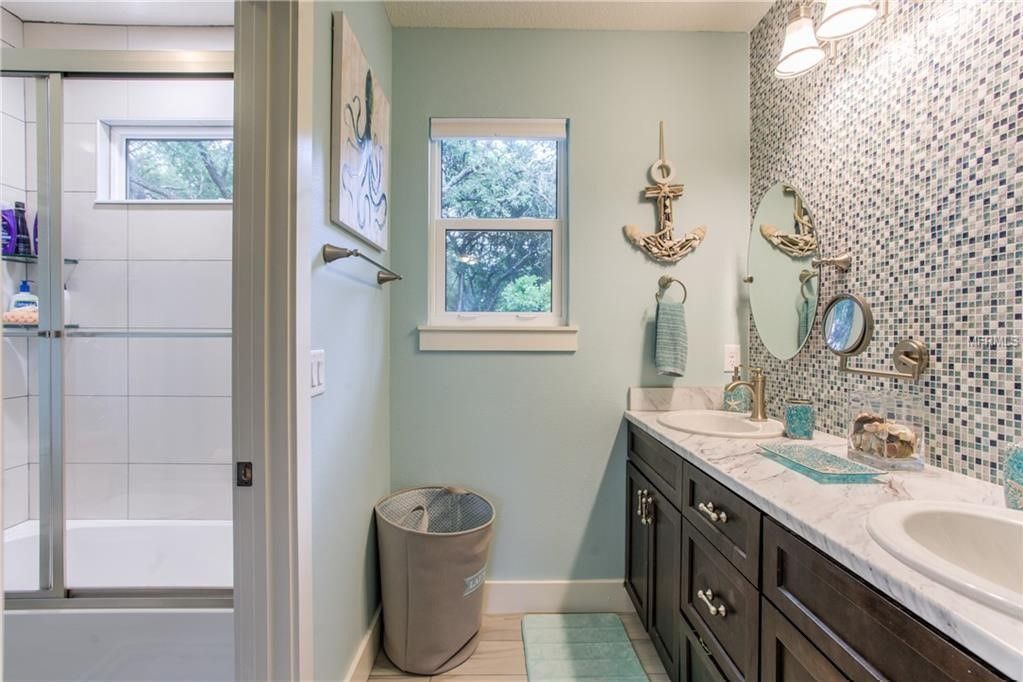 A bathroom with a sink, mirrors, and a walk-in shower.