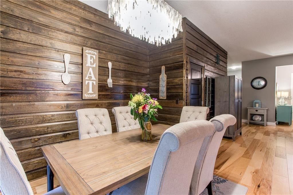 A dining room with a table and chairs and a rug