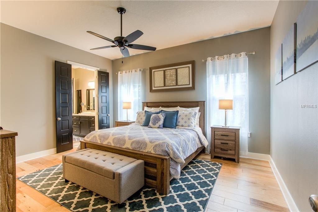 A bedroom with a large bed and a chandelier.