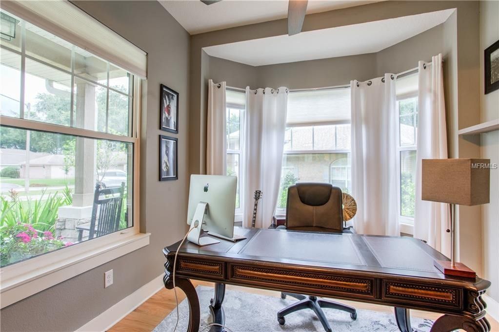 A home office with a desk , chair , and cabinets.