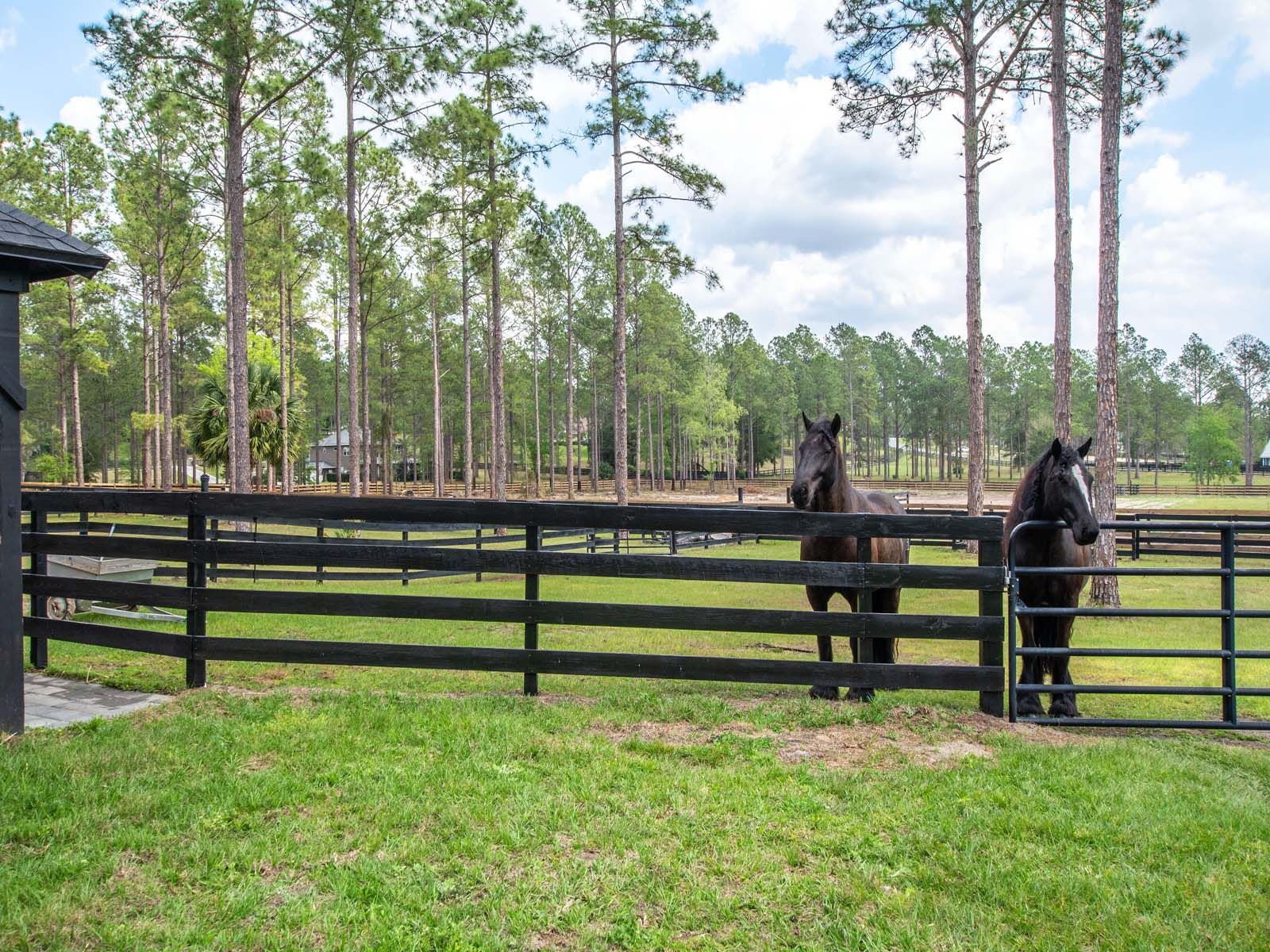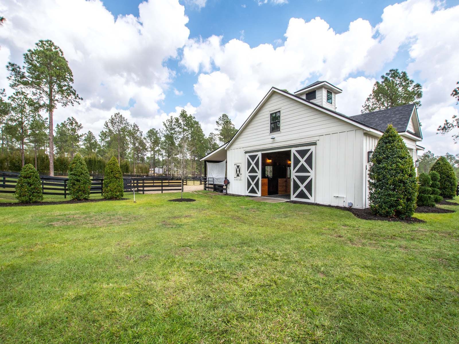 A white house with a black roof is sitting on top of a lush green field.